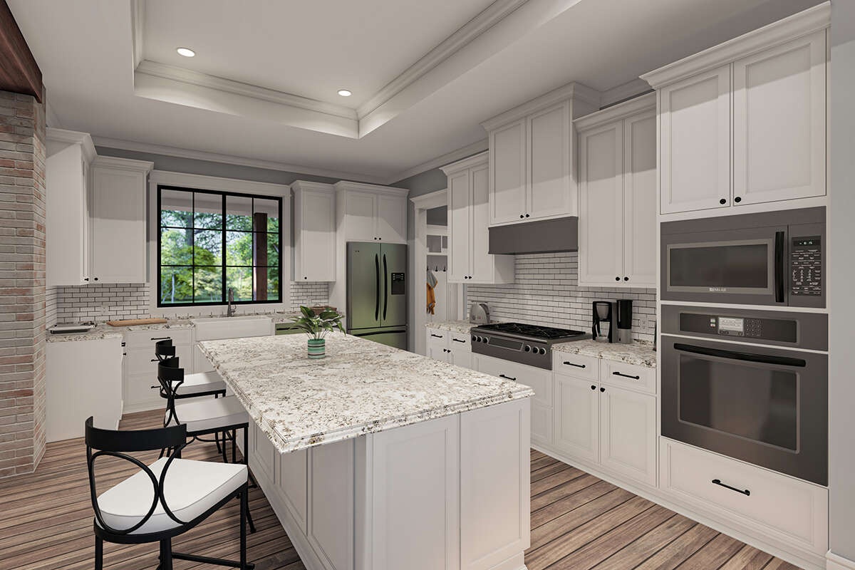 A large island with seating anchors the space, complemented by plenty of cabinet storage and a walk-in pantry for everyday essentials.