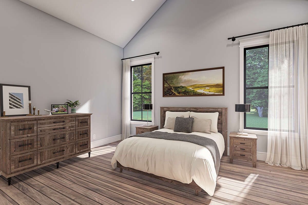 The main-level primary suite is a private retreat. The bedroom features large windows for natural light and optional vaulted or tray ceilings.
