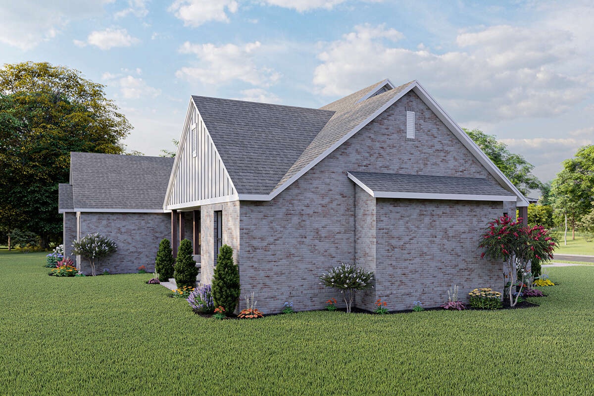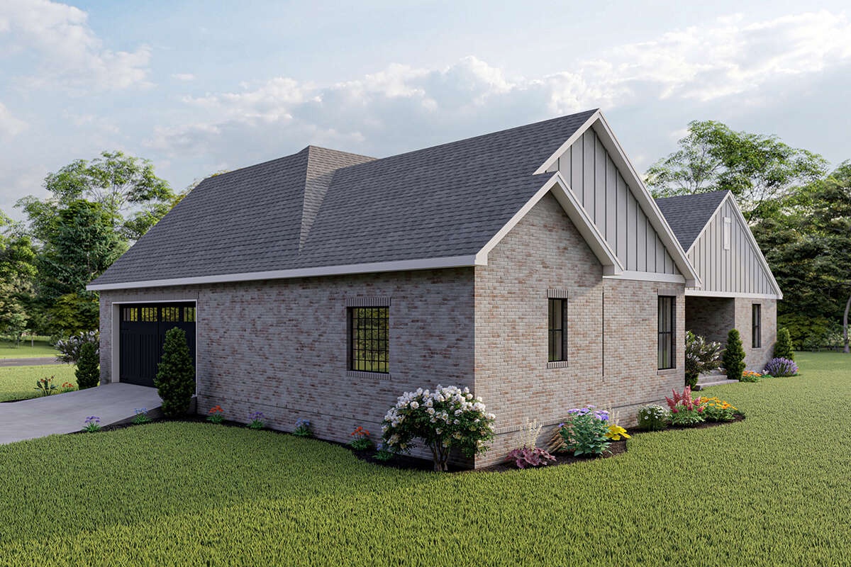 The side-entry garage offers room for two or three vehicles plus storage for tools, bikes, or lawn equipment.